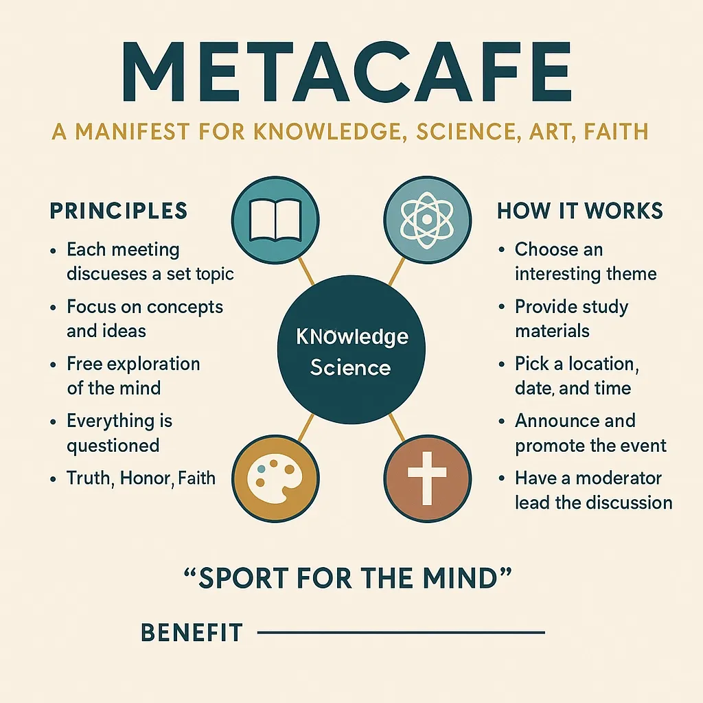 Ce este METACAFE METACAFE este un manifest pentru o societate bazată pe cunoaștere, știință, artă și credință, toate contopite într-un cadru funcțional care să permită omului să își atingă potențialul maxim. METACAFE înseamnă întâlniri cu oamenii din comunitatea ta în care se discută liber, fără prejudecăți, diferite idei și concepte.